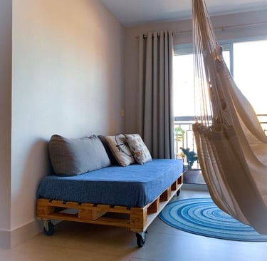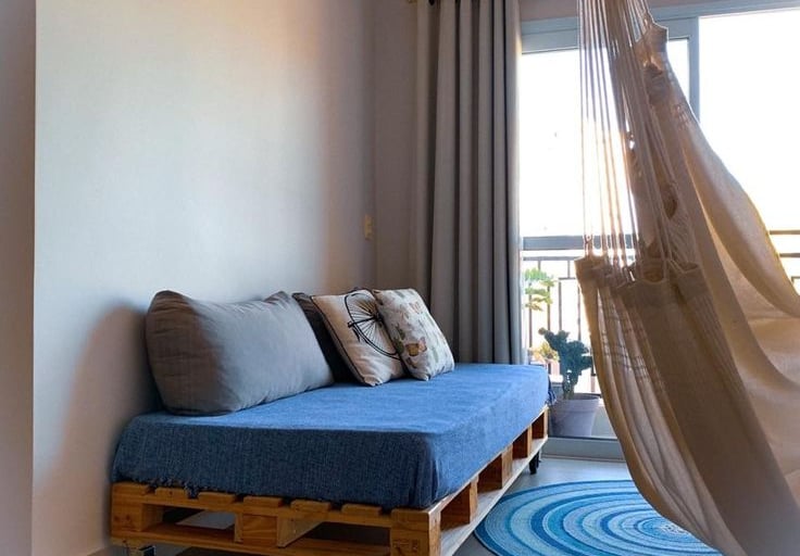 Paletes de madeira são extremamente versáteis e podem ser transformados em sofás, mesas de centro ou até camas. Além de sustentável, dá um toque rústico e moderno ao ambiente.