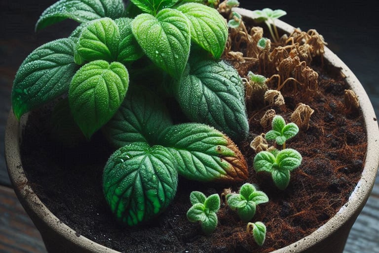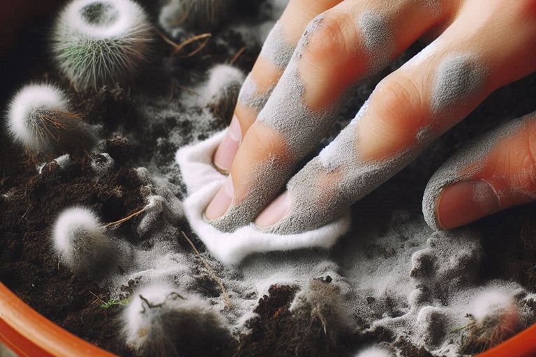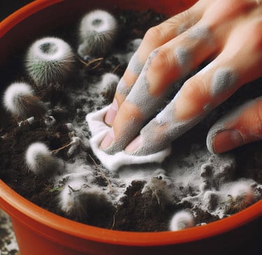 A presença de mofo esbranquiçado ou verde na superfície do substrato indica um ambiente excessivamente úmido e propício ao crescimento de fungos. Para evitar esse problema, mantenha a ventilação adequada e verifique se os furos de drenagem do vaso estão desobstruídos.